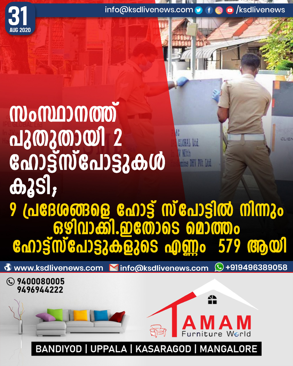 കേരളം സംസ്ഥാനത്ത് പുതുതായി രണ്ട് ഹോട്ട് സ്പോട്ടുകൾ കൂടി ; 9 പ്രദേശങ്ങളെ ഹോട്ട് സ്പോട്ടില് നിന്നും ഒഴിവാക്കി. ഇതോടെ മൊത്തം ഹോട്ട്സ്പോട്ടുകളുടെ എണ്ണം 579 ആയി.August 31, 2020