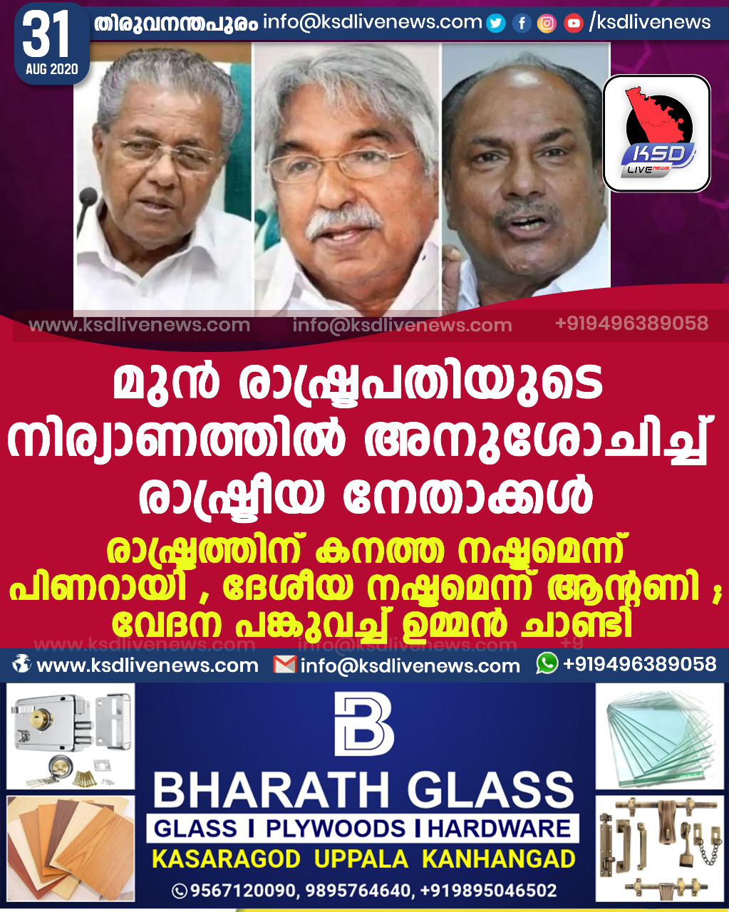 കേരളം മുൻ രാഷ്ട്രപതിയുടെ നിര്യാണത്തിൽ അനുശോചിച്ച് രാഷ്ട്രീയ നേതാക്കൾ ;രാഷ്ട്രത്തിന് കനത്ത നഷ്ടമെന്ന് പിണറായി , ദേശീയ നഷ്ടമെന്ന് ആന്റണി ; വേദന പങ്കുവച്ച് ഉമ്മൻ ചാണ്ടിAugust 31, 2020