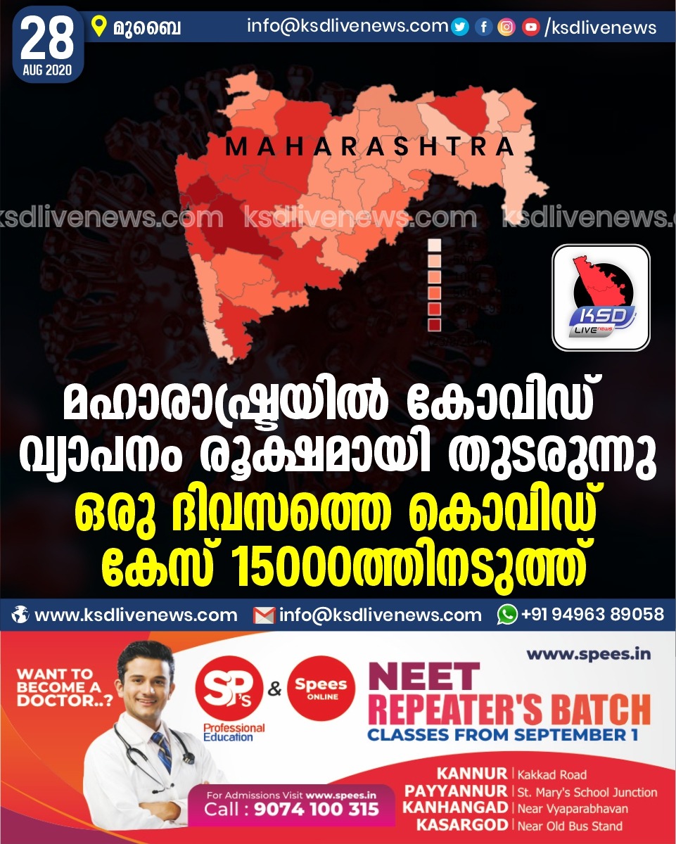 കേരളം മഹാരാഷ്ട്രയില് കോവിഡ് വ്യാപനം രൂക്ഷമായി തുടരുന്നു ;ഒരു ദിവസത്തെ കൊവിഡ് കേസ് 15000ത്തിനടുത്ത്August 28, 2020
