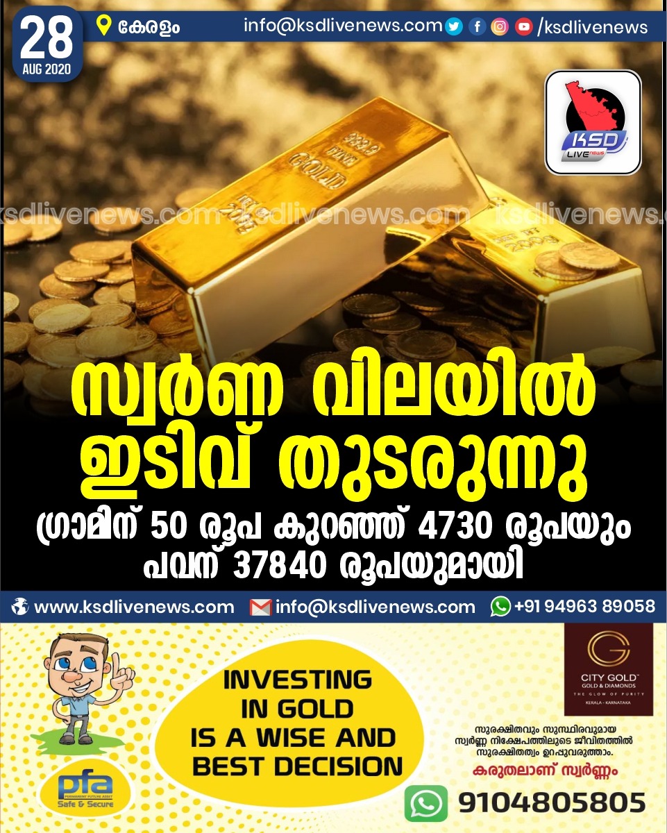 കേരളം സ്വർണ വിലയിൽ ഇടിവ് തുടരുന്നുഗ്രാമിന് 50 രൂപ കുറഞ്ഞ് 4730 രൂപയും പവന് 37840 രൂപയുമായിAugust 28, 2020