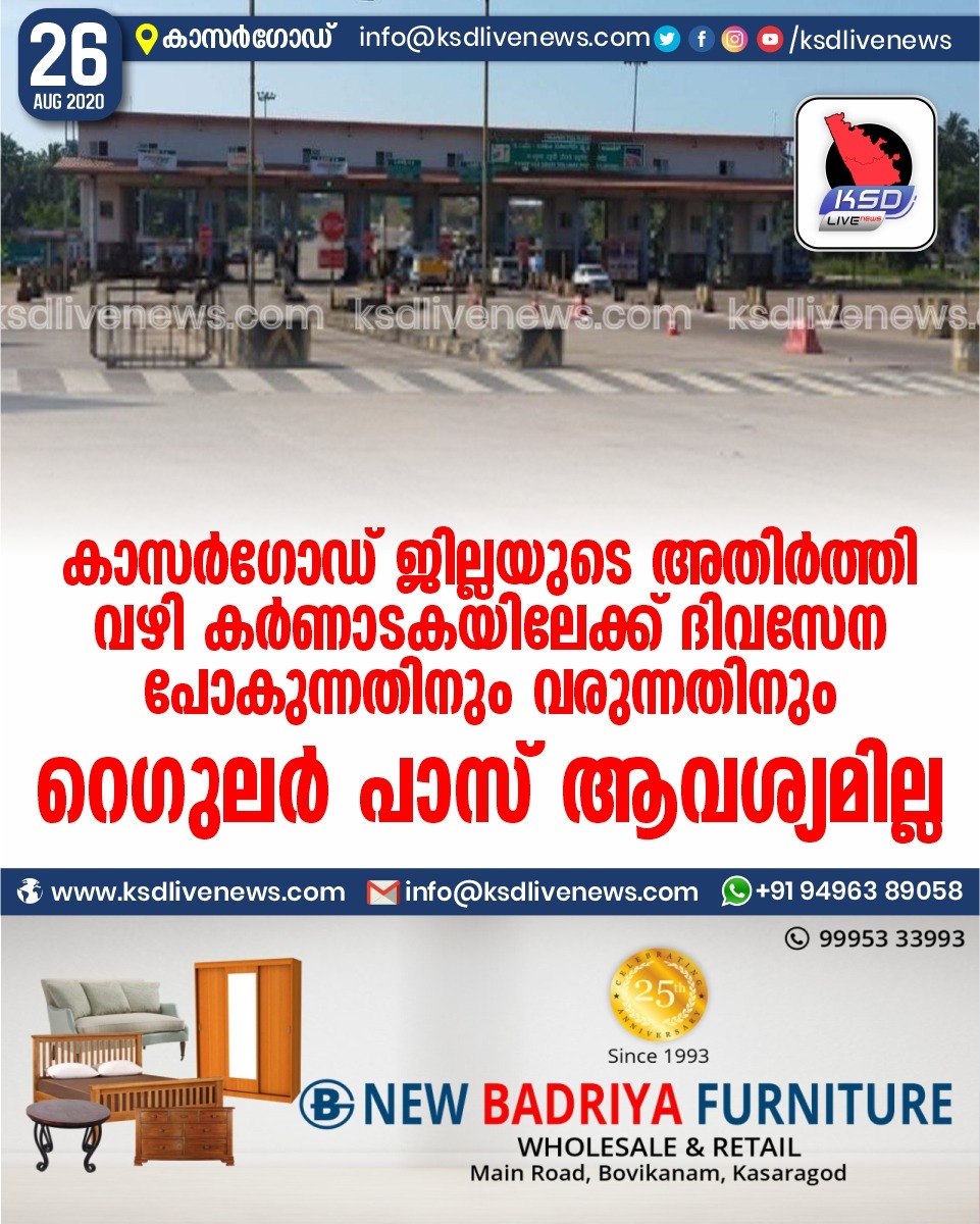 കേരളം കാസർഗോഡ് ജില്ലയുടെ അതിർത്തി വഴി കർണാടകയിലേക്ക് ദിവസേന പോകുന്നതിനും വരുന്നതിനും റെഗുലര് പാസ് ആവശ്യമില്ലAugust 26, 2020