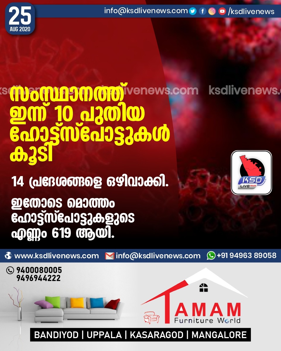 കേരളം സംസ്ഥാനത്ത് ഇന്ന് 10 പുതിയ ഹോട്ട്സ്പോട്ടുകള് കൂടി; 14 പ്രദേശങ്ങളെ ഒഴിവാക്കി.ഇതോടെ മൊത്തം ഹോട്ട്സ്പോട്ടുകളുടെ എണ്ണം 619 ആയി.August 25, 2020