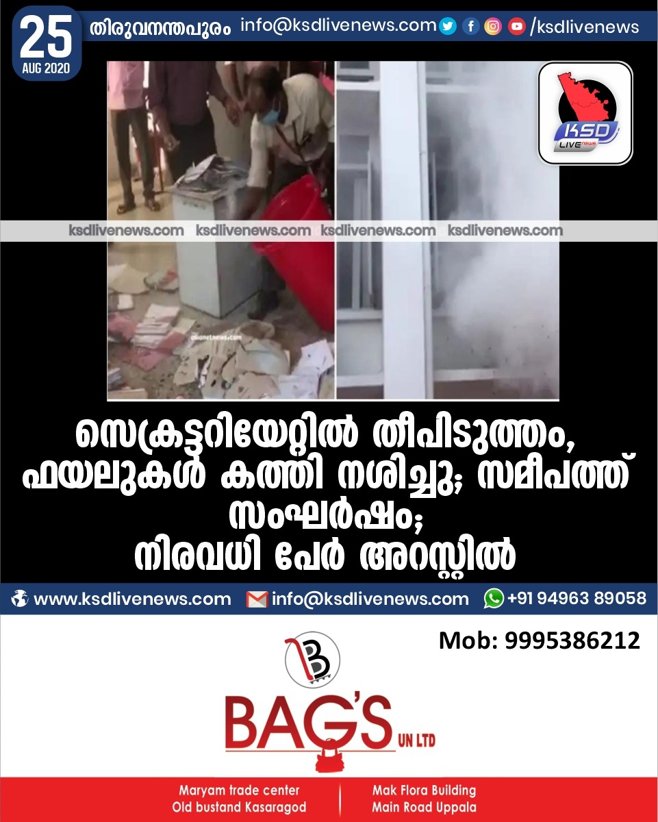 കേരളം സെക്രട്ടറിയേറ്റില് തീപിടുത്തം, ഫയലുകള് കത്തി നശിച്ചു; സമീപത്ത് സംഘര്ഷം;നിരവധി പേർ അറസ്റ്റിൽAugust 25, 2020