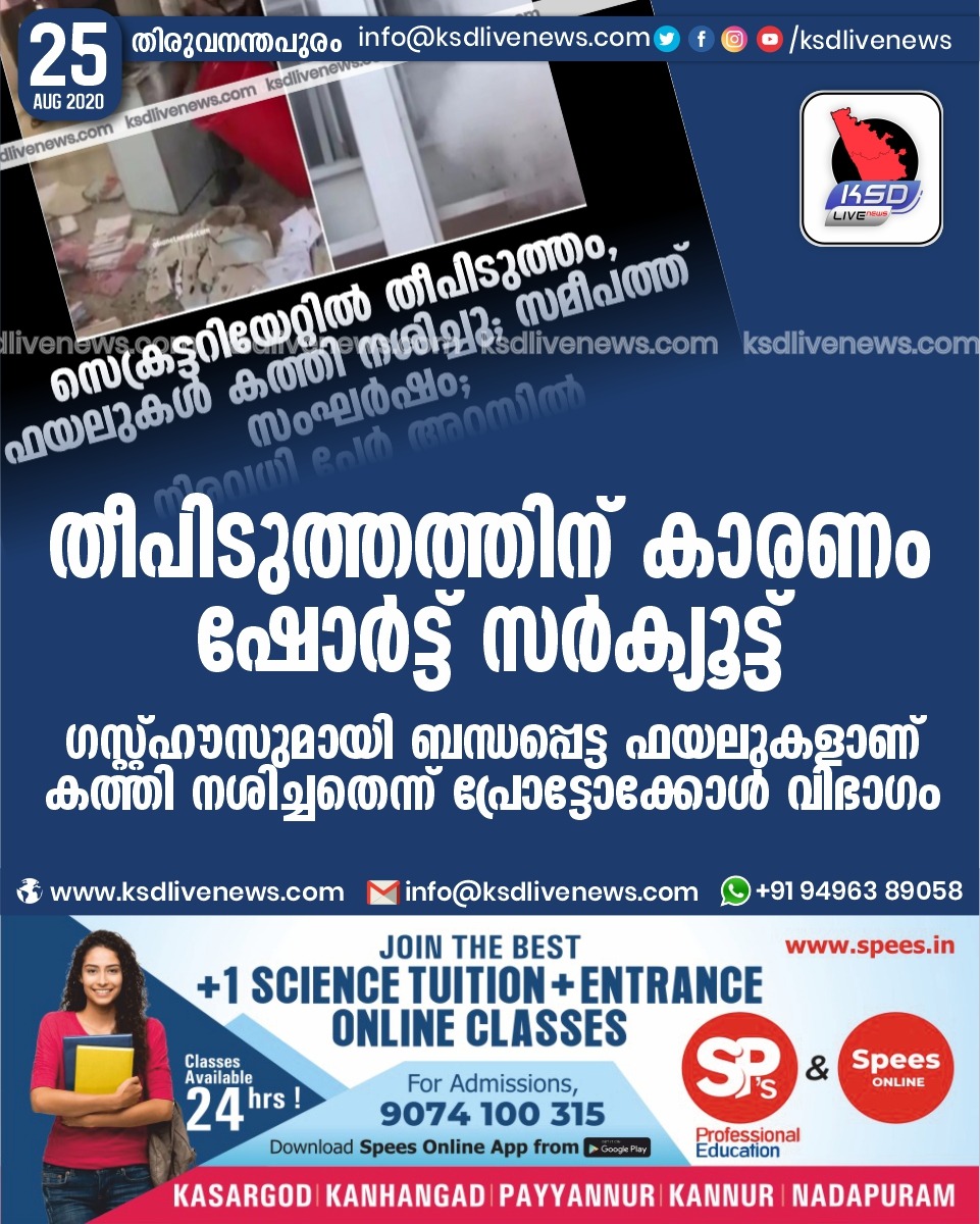 കേരളം തീപിടുത്തത്തിന് കാരണം ഷോര്ട്ട് സര്ക്യൂട്ട്: ഗസ്റ്റ്ഹൗസുമായി ബന്ധപ്പെട്ട ഫയലുകളാണ് കത്തി നശിച്ചതെന്ന് പ്രോട്ടോക്കോള് വിഭാഗംAugust 25, 2020