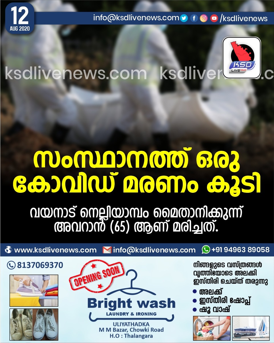 കേരളം സംസ്ഥാനത്ത് ഒരു കോവിഡ് മരണം കൂടി,വയനാട് നെല്ലിയാമ്പം മൈതാനിക്കുന്ന് അവറാന് (65) ആണ് മരിച്ചത്.August 12, 2020