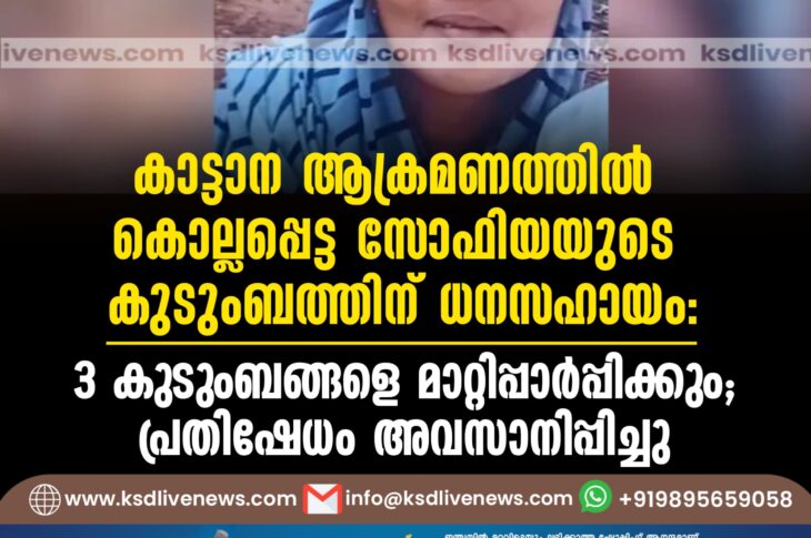 കേരളം കാട്ടാന ആക്രമണത്തിൽ കൊല്ലപ്പെട്ട സോഫിയയുടെ കുടുംബത്തിന് ധനസഹായം, 3 കുടുംബങ്ങളെ മാറ്റിപ്പാർപ്പിക്കും; പ്രതിഷേധം അവസാനിപ്പിച്ചുFebruary 11, 2025