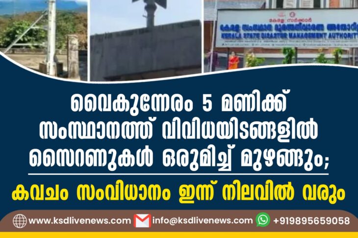 കേരളം വൈകുന്നേരം 5 മണിക്ക് സംസ്ഥാനത്ത് വിവിധയിടങ്ങളില് സൈറണുകള് ഒരുമിച്ച് മുഴങ്ങും; കവചം സംവിധാനം ഇന്ന് നിലവില് വരുംJanuary 21, 2025