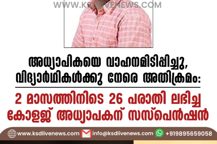 കേരളം അധ്യാപികയെ വാഹനമിടിപ്പിച്ചു, വിദ്യാർഥികൾക്കു നേരെ അതിക്രമം: 2 മാസത്തിനിടെ 26 പരാതി ലഭിച്ച കോളജ് അധ്യാപകന് സസ്പെൻഷൻDecember 10, 2024