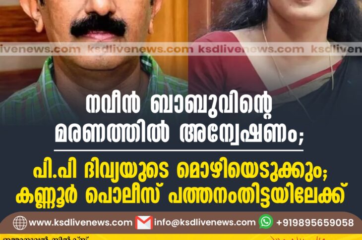 കേരളം നവീൻ ബാബുവിന്റെ മരണത്തില് അന്വേഷണം; പിപി ദിവ്യയുടെ മൊഴിയെടുക്കും; കണ്ണൂര് പൊലീസ് പത്തനംതിട്ടയിലേക്ക്October 17, 2024