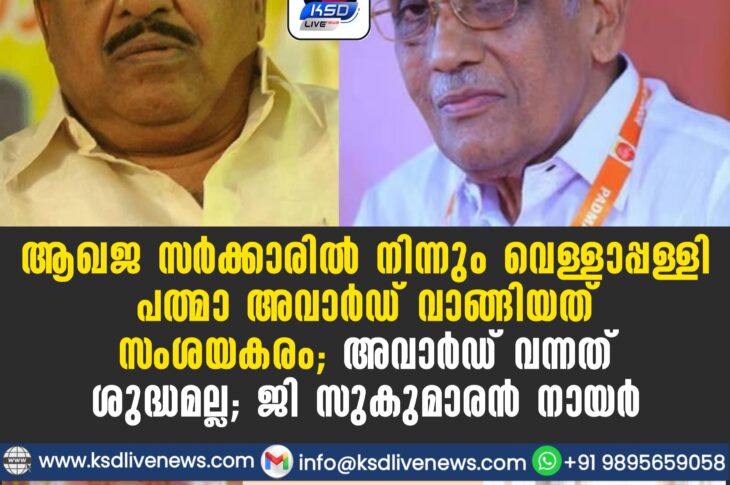 കേരളം BJP സർക്കാരിൽ നിന്നും വെള്ളാപ്പള്ളി പത്മാ അവാർഡ് വാങ്ങിയത് സംശയകരം; അവാർഡ് വന്നത് ശുദ്ധമല്ല’; ജി സുകുമാരൻ നായർJanuary 28, 2026