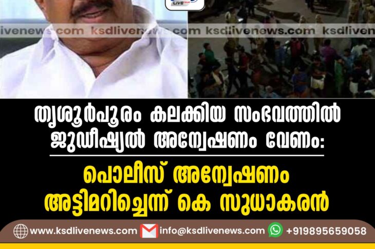 കേരളം തൃശൂര്പൂരം കലക്കിയ സംഭവത്തില് ജുഡീഷ്യല് അന്വേഷണം വേണം: പൊലീസ് അന്വേഷണം അട്ടിമറിച്ചെന്ന് കെ സുധാകരന്September 20, 2024