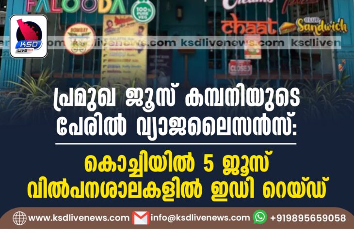 കേരളം പ്രമുഖ ജൂസ് കമ്പനിയുടെ പേരിൽ വ്യാജലൈസൻസ്: കൊച്ചിയിൽ 5 ജൂസ് വിൽപനശാലകളിൽ ഇഡി റെയ്ഡ്September 17, 2024
