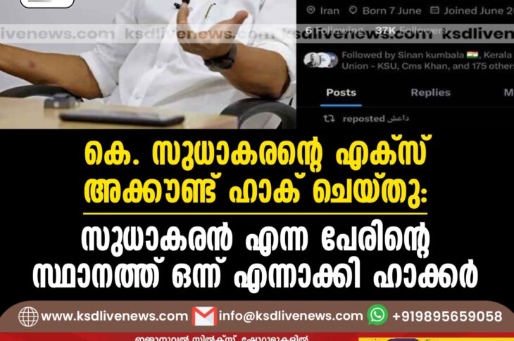 കേരളം കെ. സുധാകരന്റെ എക്സ് അക്കൗണ്ട് ഹാക് ചെയ്തു: സുധാകരന് എന്ന പേരിന്റെ സ്ഥാനത്ത് ഒന്ന് എന്നാക്കി ഹാക്കര്September 17, 2024