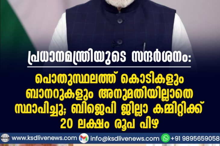 കേരളം പ്രധാനമന്ത്രിയുടെ സന്ദര്ശനം: പൊതുസ്ഥലത്ത് കൊടികളും ബാനറുകളും അനുമതിയില്ലാതെ സ്ഥാപിച്ചു; ബിജെപി ജില്ലാ കമ്മിറ്റിക്ക് 20 ലക്ഷം രൂപ പിഴJanuary 24, 2026