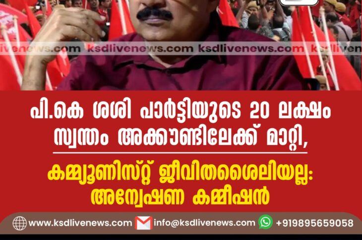 കേരളം പികെ ശശി പാർട്ടിയുടെ 20 ലക്ഷം സ്വന്തം അക്കൗണ്ടിലേക്ക് മാറ്റി, കമ്മ്യൂണിസ്റ്റ് ജീവിതശൈലിയല്ല’: അന്വേഷണ കമ്മീഷൻAugust 19, 2024