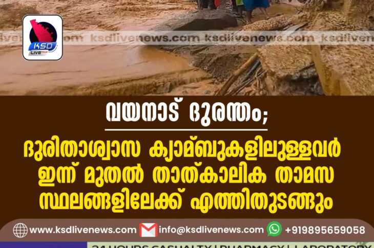 കേരളം വയനാട് ദുരന്തം; ദുരിതാശ്വാസ ക്യാമ്ബുകളിലുള്ളവര് ഇന്ന് മുതല് താത്കാലിക താമസ സ്ഥലങ്ങളിലേക്ക് എത്തിതുടങ്ങുംAugust 13, 2024
