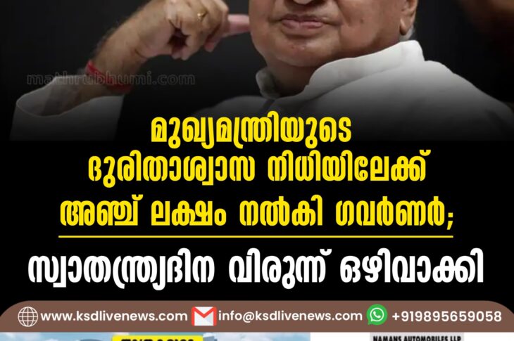 കേരളം മുഖ്യമന്ത്രിയുടെ ദുരിതാശ്വാസനിധിയിലേക്ക് അഞ്ച് ലക്ഷം നൽകി ഗവർണർ; സ്വാതന്ത്ര്യദിന വിരുന്ന് ഒഴിവാക്കിAugust 7, 2024
