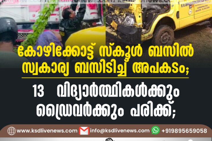 കേരളം കോഴിക്കോട്ട് സ്കൂൾ ബസിൽ സ്വകാര്യ ബസിടിച്ച് അപകടം: 13 വിദ്യാർത്ഥികൾക്കും ഡ്രൈവർക്കും പരിക്ക്August 6, 2024