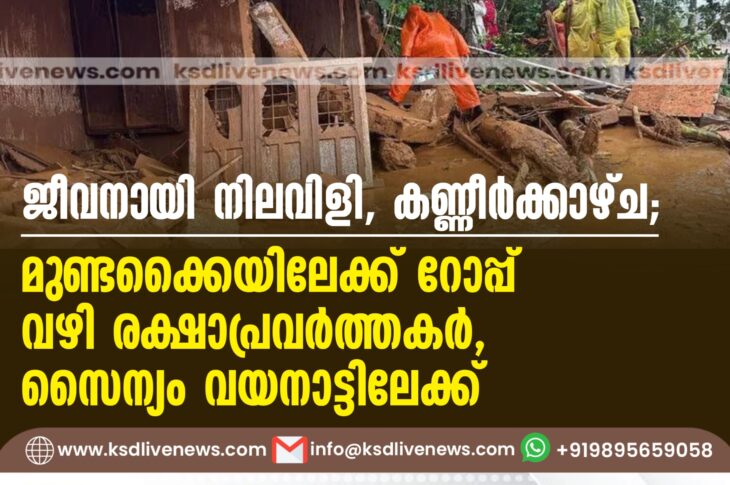 കേരളം ജീവനായി നിലവിളി, കണ്ണീർക്കാഴ്ച; മുണ്ടക്കൈയിലേക്ക് റോപ്പ് വഴി രക്ഷാപ്രവർത്തകർ,സൈന്യം വയനാട്ടിലേക്ക്July 30, 2024