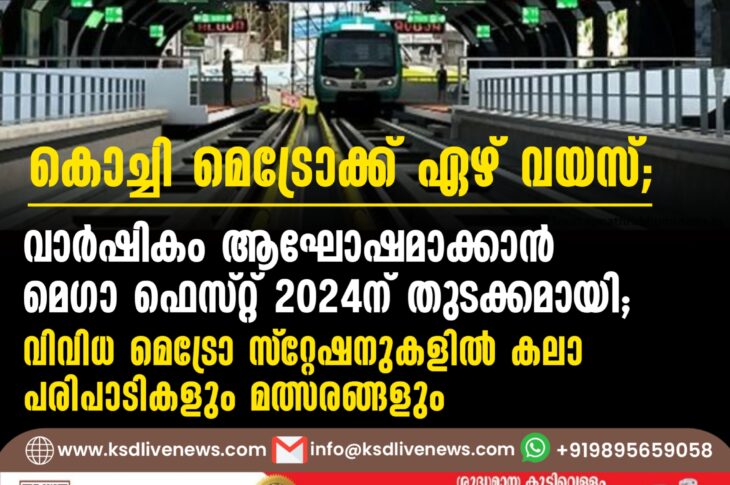 കേരളം കൊച്ചി മെട്രോക്ക് ഏഴ് വയസ്; വാര്ഷികം ആഘോഷമാക്കാൻ മെഗാ ഫെസ്റ്റ് 2024 ന് തുടക്കമായി; വിവിധ മെട്രോ സ്റ്റേഷനുകളിൽ കലാ പരിപാടികളും മത്സരങ്ങളുംJune 14, 2024
