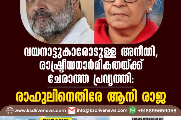 കേരളം വയനാട്ടുകാരോടുള്ള അനീതി, രാഷ്ട്രീയധാര്മികതയ്ക്ക് ചേരാത്ത പ്രവൃത്തി- രാഹുലിനെതിരേ ആനി രാജJune 8, 2024
