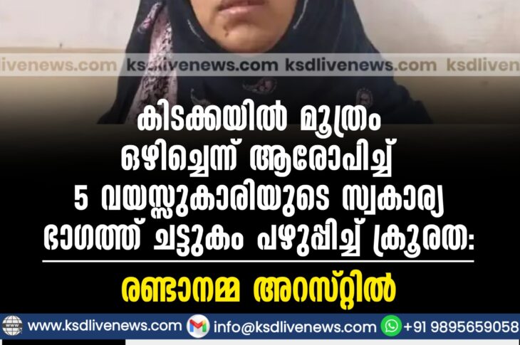 കേരളം കിടക്കയില് മൂത്രം ഒഴിച്ചെന്ന് ആരോപിച്ച് 5 വയസ്സുകാരിയുടെ സ്വകാര്യ ഭാഗത്ത് ചട്ടുകം പഴുപ്പിച്ച് ക്രൂരത; രണ്ടാനമ്മ അറസ്റ്റില്January 9, 2026