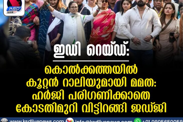 കേരളം ഇഡി റെയ്ഡ്: കൊൽക്കത്തയിൽ കൂറ്റൻ റാലിയുമായി മമത: ഹർജി പരിഗണിക്കാതെ കോടതിമുറി വിട്ടിറങ്ങി ജഡ്ജിJanuary 9, 2026