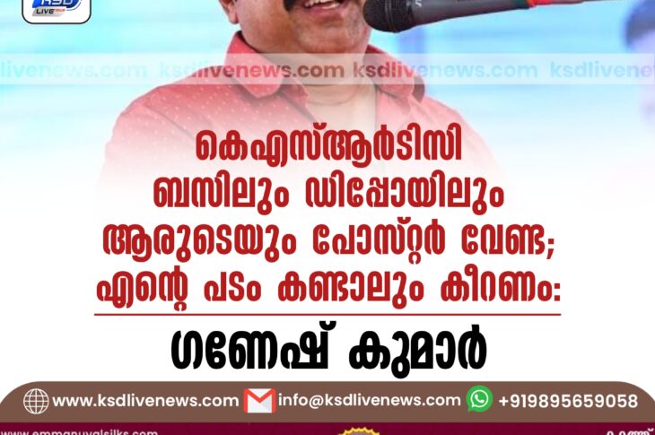 കേരളം കെ.എസ്.ആർ.ടി.സി ബസിലും ഡിപ്പോയിലും ആരുടെയും പോസ്റ്റര് വേണ്ട; എന്റെ പടം കണ്ടാലും കീറണം: ഗണേഷ് കുമാര്June 8, 2024