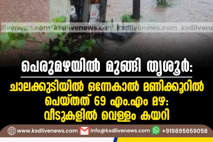 കേരളം പെരുമഴയിൽ മുങ്ങി തൃശൂർ: ചാലക്കുടിയിൽ ഒന്നേകാൽ മണിക്കൂറിൽ പെയ്തത് 69 എംഎം മഴ, വീടുകളില് വെള്ളം കയറിJune 1, 2024