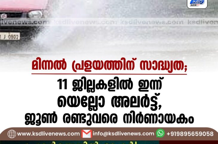 കേരളം മിന്നൽ പ്രളയത്തിന് സാദ്ധ്യത; 11 ജില്ലകളിൽ ഇന്ന് യെല്ലോ അലർട്ട്, ജൂൺ രണ്ടുവരെ നിർണായകംMay 30, 2024