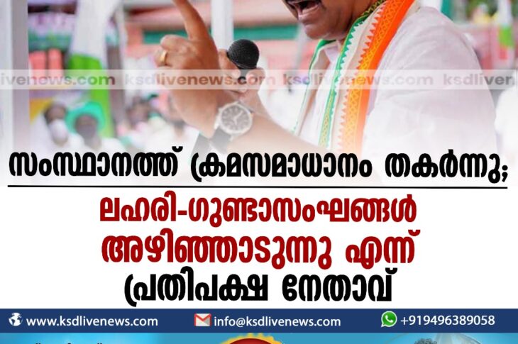 കേരളം സംസ്ഥാനത്ത് ക്രമസമാധാനം തകർന്നു; ലഹരി-ഗുണ്ടാസംഘങ്ങൾ അഴിഞ്ഞാടുന്നു എന്ന് പ്രതിപക്ഷ നേതാവ്May 11, 2024