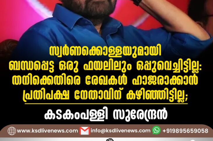 കേരളം സ്വര്ണക്കൊള്ളയുമായി ബന്ധപ്പെട്ട ഒരു ഫയലിലും ഒപ്പുവെച്ചിട്ടില്ല: തനിക്കെതിരെ രേഖകള് ഹാജരാക്കാന് പ്രതിപക്ഷനേതാവിന് കഴിഞ്ഞിട്ടില്ല; കടകംപള്ളി സുരേന്ദ്രന്December 31, 2025