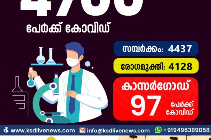 കേരളംകോവിഡ് 19 സംസ്ഥാനത്ത് ഇന്ന് 4700 പേർക്ക് കോവിഡ് സ്ഥിരീകരിച്ചു. സമ്പർക്കം വഴി 4437 പേർക്കും ; ആശ്വാസമായി 4128 പേർക്ക് രോഗ മുക്തിയും ; കാസർഗോഡ് ജില്ലയിൽ 97 പേർക്ക് പുതിയ കോവിഡ് കേസുകൾ ; മരണം 66December 2, 2021