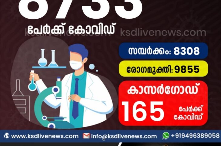 സംസ്ഥാനത്ത് ഇന്ന് 8733 പേർക്ക് കോവിഡ് സ്ഥിരീകരിച്ചു. സമ്പർക്കം വഴി 8308 പേർക്കും ; ആശ്വാസമായി 9855 പേർക്ക് രോഗ മുക്തിയും ; കാസർഗോഡ് ജില്ലയിൽ 165 പേർക്ക് പുതിയ കോവിഡ് കേസുകൾ ; മരണം 118