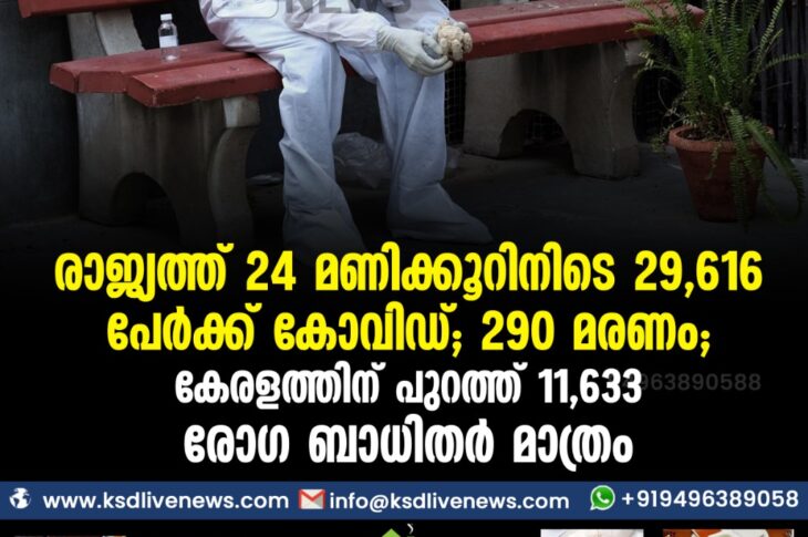 കോവിഡ് 19ദേശീയം രാജ്യത്ത് 24 മണിക്കൂറിനിടെ 29,616 പേർക്ക് കോവിഡ്; 290 മരണം ; കേരളത്തിന് പുറത്ത് 11,633 രോഗ ബാധിതർ മാത്രംSeptember 25, 2021