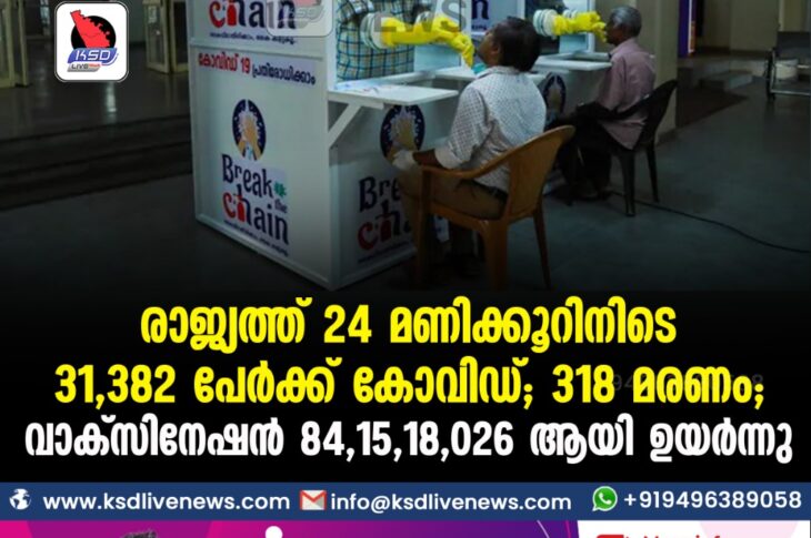 കോവിഡ് 19ദേശീയം രാജ്യത്ത് 24 മണിക്കൂറിനിടെ 31,382 പേർക്ക് കോവിഡ്; 318 മരണം; വാക്സിനേഷൻ 84,15,18,026 ആയി ഉയർന്നുSeptember 24, 2021