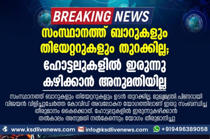 കേരളംകോവിഡ് 19 സംസ്ഥാനത്ത് ബാറുകളും തിയേറ്ററുകളും തുറക്കില്ല; ഹോട്ടലുകളില് ഇരുന്നുകഴിക്കാന് അനുമതിയില്ലSeptember 18, 2021