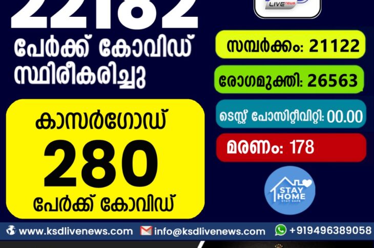വീണ്ടും കുതിച്ചുയർന്ന് കോവിഡ് ; സംസ്ഥാനത്ത് ഇന്ന് 22,182 പേർക്ക് കോവിഡ് സ്ഥിരീകരിച്ചു. സമ്പർക്കം വഴി 21,122 പേർക്കും ; ആശ്വാസമായി 26523 പേർക്ക് രോഗ മുക്തിയും ; കാസർഗോഡ് ജില്ലയിൽ 280 പേർക്ക് പുതിയ കോവിഡ് കേസുകൾ ; മരണം 178
