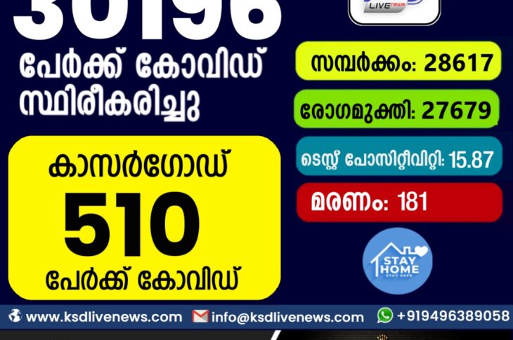 കുതിച്ചുയർന്ന് കോവിഡ്; സംസ്ഥാനത്ത് ഇന്ന് 30196 പേർക്ക് കോവിഡ് സ്ഥിരീകരിച്ചു. സമ്പർക്കം വഴി 28617 പേർക്കും ; ആശ്വാസമായി 27679 പേർക്ക് രോഗ മുക്തിയും ; കാസർഗോഡ് ജില്ലയിൽ 510 പേർക്ക് പുതിയ കോവിഡ് കേസുകൾ ; മരണം 181