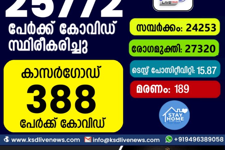 കേരളംകോവിഡ് 19 സംസ്ഥാനത്ത് ഇന്ന് 25,772 പേർക്ക് കോവിഡ് സ്ഥിരീകരിച്ചു. സമ്പർക്കം വഴി 24,253 പേർക്കും ; ആശ്വാസമായി 27,320 പേർക്ക് രോഗ മുക്തി; കാസർഗോഡ് ജില്ലയിൽ 388 പേർക്ക് പുതിയ കോവിഡ് കേസുകൾ ; മരണം 188September 7, 2021