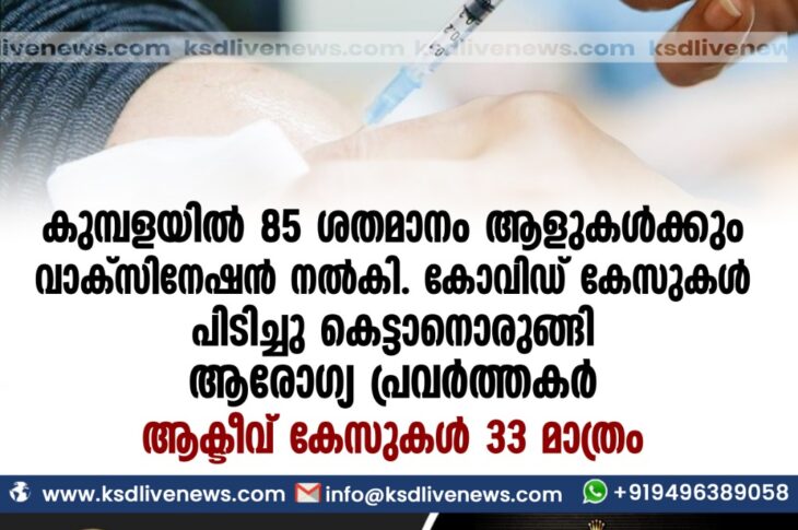 കാസർഗോഡ്കോവിഡ് 19 കുമ്പളയിൽ 85ശതമാനം ആളുകൾക്കും വാക്സിനേഷൻ നൽകി.കോവിഡ് കേസുകൾ പിടിച്ചുകെട്ടാനൊരുങ്ങി ആരോഗ്യ പ്രവർത്തകർ.ആക്ടീവ് കേസുകൾ 33 മാത്രം.September 6, 2021