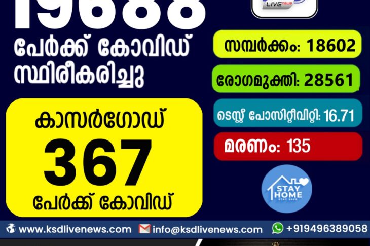 കേരളംകോവിഡ് 19 സംസ്ഥാനത്ത് ഇന്ന് 19,688 പേർക്ക് കോവിഡ് സ്ഥിരീകരിച്ചു. സമ്പർക്കം വഴി 18602 പേർക്കും ; ആശ്വാസമായി 28,561 പേർക്ക് രോഗ മുക്തിയും ; കാസർഗോഡ് ജില്ലയിൽ 367 പേർക്ക് പുതിയ കോവിഡ് കേസുകൾ ; മരണം 135September 6, 2021