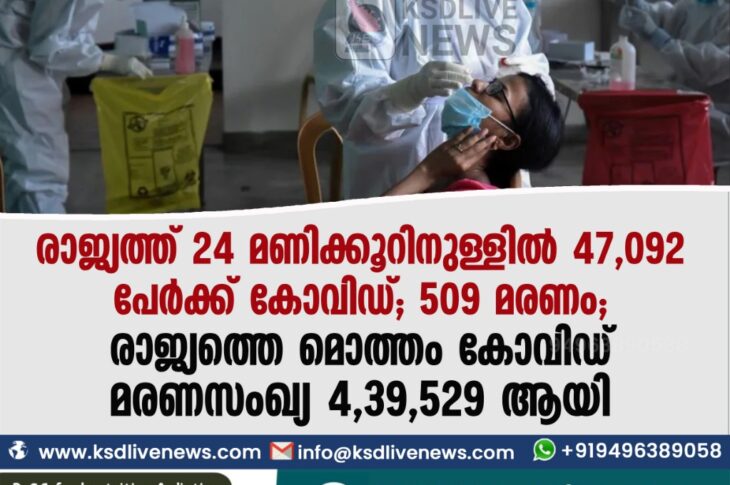 കോവിഡ് 19ദേശീയം രാജ്യത്ത് 24 മണിക്കൂറിനുള്ളിൽ 47,092 പേർക്ക് കോവിഡ്; 509 മരണം ; രാജ്യത്തെ മൊത്തം കോവിഡ് മരണസംഖ്യ 4,39,529 ആയിSeptember 2, 2021