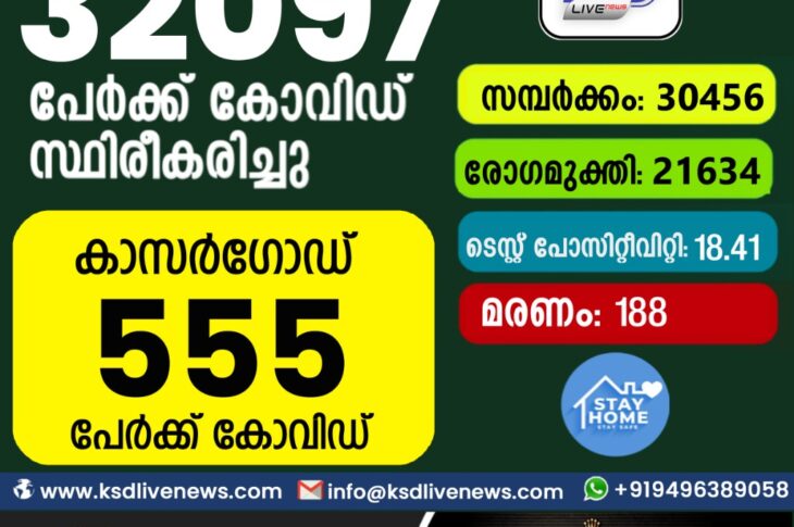 കേരളംകോവിഡ് 19 കുതിച്ചുയർന്ന് കോവിഡ് ; സംസ്ഥാനത്ത് ഇന്ന് 32,097 പേർക്ക് കോവിഡ് സ്ഥിരീകരിച്ചു. സമ്പർക്കം വഴി 30,456 പേർക്കും ; ആശ്വാസമായി 21,634 പേർക്ക് രോഗ മുക്തിയും ; കാസർഗോഡ് ജില്ലയിൽ 555 പേർക്ക് പുതിയ കോവിഡ് കേസുകൾ ; മരണം 188September 2, 2021