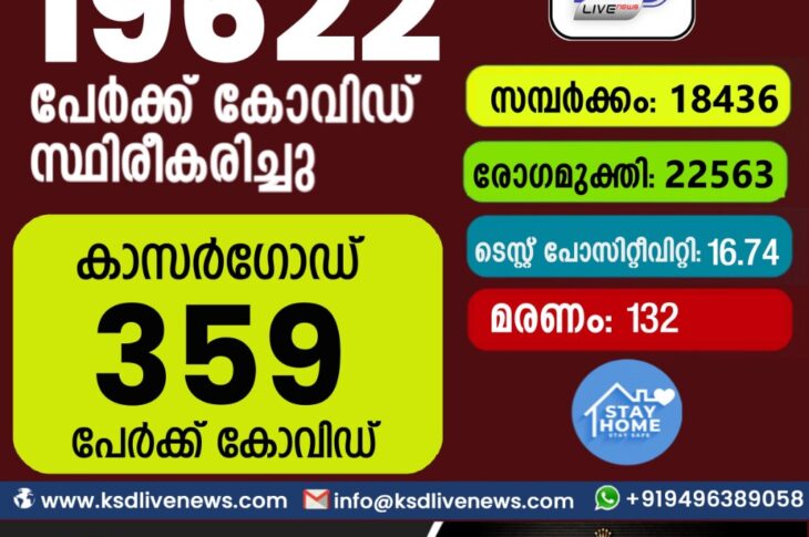കേരളംകോവിഡ് 19 സംസ്ഥാനത്ത് ഇന്ന് 19,622 പേർക്ക് കോവിഡ് സ്ഥിരീകരിച്ചു. സമ്പർക്കം വഴി 18,436 പേർക്കും ; ആശ്വാസമായി 22,563 പേർക്ക് രോഗ മുക്തിയും ; കാസർഗോഡ് ജില്ലയിൽ 359 പേർക്ക് പുതിയ കോവിഡ് കേസുകൾ ; മരണം 132August 30, 2021