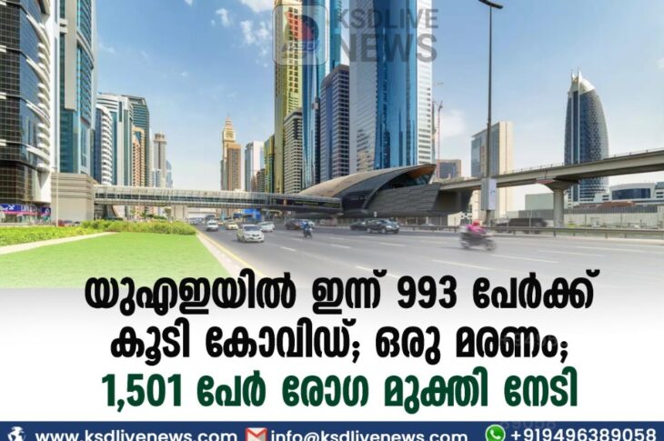കോവിഡ് 19ഗൾഫ് യുഎഇയില് ഇന്ന് 993 പേര്ക്ക് കൂടി കോവിഡ് ; ഒരു മരണം ; 1,501 പേർ രോഗ മുക്തി നേടിAugust 30, 2021