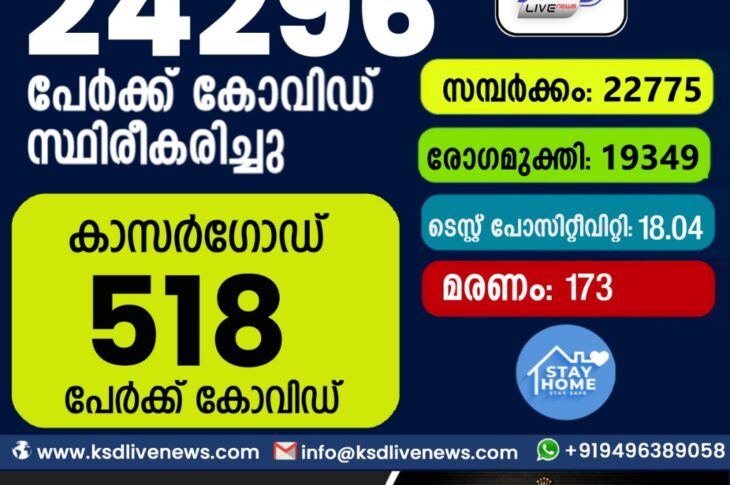 കേരളംകോവിഡ് 19 കോവിഡിൽ വിറച്ച് കേരളം; സംസ്ഥാനത്ത് ഇന്ന് 24,296 പേർക്ക് കോവിഡ് സ്ഥിരീകരിച്ചു. സമ്പർക്കം വഴി 22,775 പേർക്കും ; 19,349 പേർക്ക് രോഗ മുക്തിയും ; കാസർഗോഡ് ജില്ലയിൽ 518 പേർക്ക് കോവിഡ് ; മരണം 173August 24, 2021