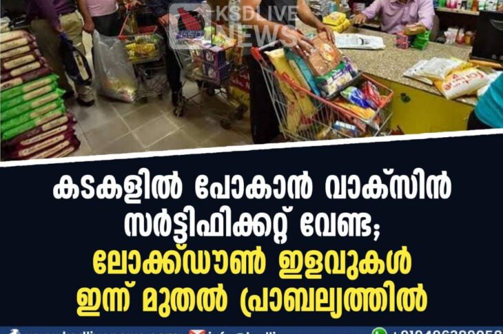 കേരളംകോവിഡ് 19 കടകളില് പോകാന് വാക്സിന് സര്ട്ടിഫിക്കറ്റ് വേണ്ട; ലോക്ക്ഡൗണ് ഇളവുകള് ഇന്ന് മുതല് പ്രാബല്യത്തില്August 11, 2021