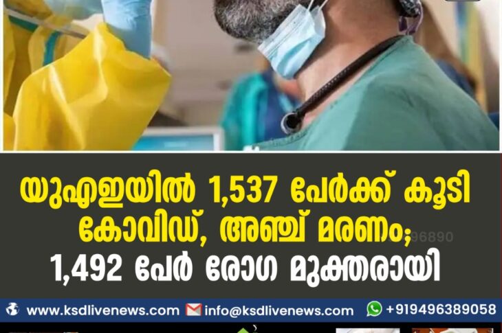 കോവിഡ് 19ഗൾഫ് യുഎഇയില് 1,537 പേര്ക്ക് കൂടി കോവിഡ്, അഞ്ച് മരണം ; 1,492 പേർ രോഗ മുക്തരായിAugust 2, 2021