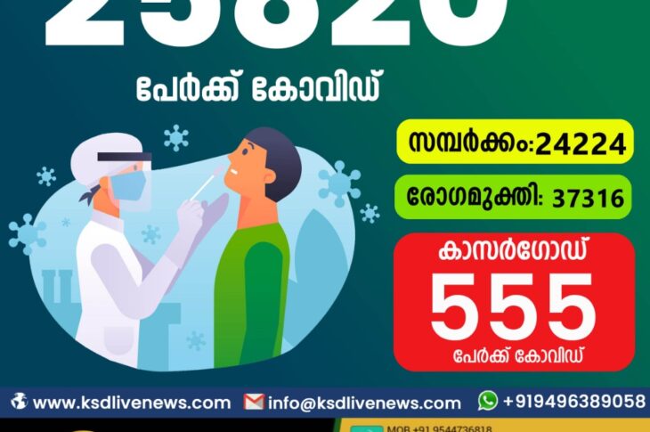 കേരളംകോവിഡ് 19 സംസ്ഥാനത്ത് ഇന്ന് 25820 പേർക്ക് കോവിഡ് സ്ഥിരീകരിച്ചു. സമ്പർക്കം വഴി 24224 പേർക്കും ; ആശ്വാസമായി 37316 പേർക്ക് രോഗ മുക്തിയും ; കാസർഗോഡ് ജില്ലയിൽ 555 പേർക്ക് പുതിയ കോവിഡ് കേസുകൾ ; മരണം 188May 23, 2021